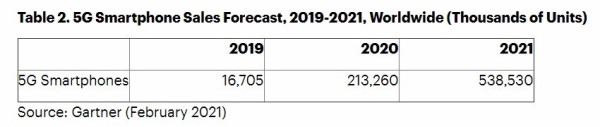此外,Gartner还认为,随着中低端5G手机的大量铺货,5G手机的销量将大幅提升,预测将达到5.39亿部,占今年智能手机总销量的35%。作为对比,2020年全球销售了2.13亿部5G手机,2019年仅为1670万部。