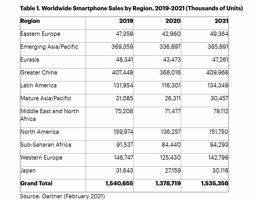 根据Gartner的统计结果,2019年全球智能手机销量为15.4亿部,2020年下降至约13.8亿部。如果今年恢复至15亿部以上,则恰好回到2019年的水平。