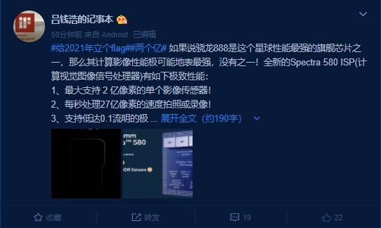 除此之外,这款手机在影像系统上也将会明显的提升。此前中兴通讯吕钱浩表示,骁龙888不仅是目前性能最强的旗舰芯片之一,其计算影像性能也极可能是地表最强,全新的Spectra 580 ISP能带来最大2亿像素相机传感器支持,还支持每秒处理27亿像素的速度拍照或录像等功能。