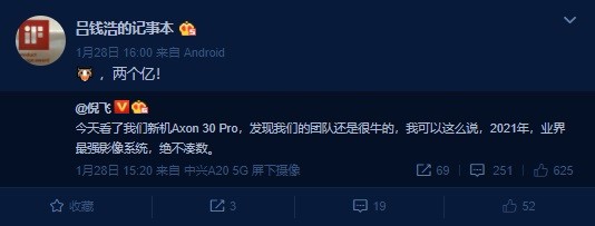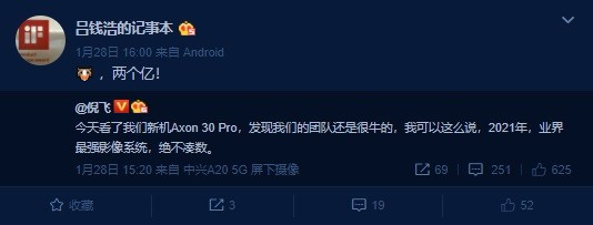 值得一提的是,吕钱浩也曾在中兴Axon 30 Pro的预热信息中多次提及“两亿”这个数字。因此合理推测,中兴Axon 30 Pro极有可能会带来双一亿像素的主摄传感器。