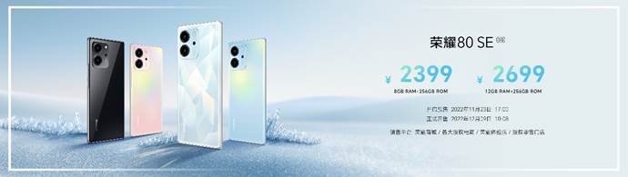 一直以来荣耀品牌坚持双轮驱动的极致产品主义,一个轮子不断洞察消费者需求与痛点,另一个轮子注重以前沿、前瞻技术持续牵引行业向前。通过持续的技术蓄力,此次全新发布的荣耀80系列呈现出体验至上的一贯追求:传承数字系列美学基因,精进工艺带来线条与光影的流动之美;深度调校旗舰芯片带来性能全面升级;以AI Vlog视频大师的技术创新助力年轻人自由自信表达,开启荣耀手机AI影像的全新赛道;让MagicOS 7.0丰富的智慧功能,帮助用户便捷享受生活与工作。荣耀80和荣耀80 Pro将于11月23日17:00开启预售,12月2日10:08正式开售;荣耀80 SE将于11月23日17:00开启预售,12月9日10:08正式开售,参与购买的用户可享受首发优惠,即刻体验“美,出手成片”的愉悦体验。