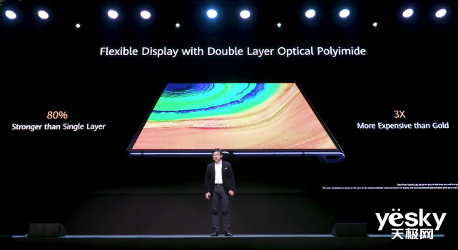 除了以上两项重要提升外,余承东还介绍了两项与华为Mate Xs可靠性相关的升级——双层聚酰亚胺薄膜以及鹰翼折叠设计。