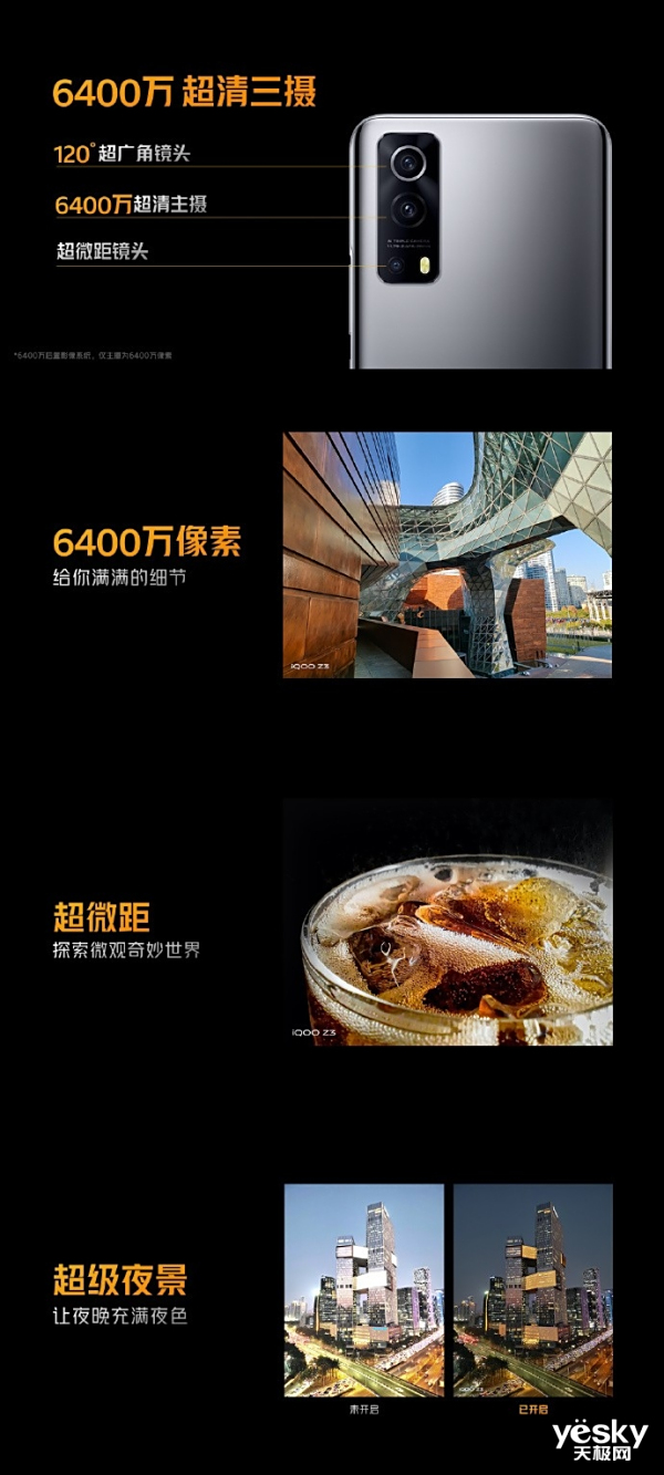 iQOO Z3在影像部分的升级,同样是十分显著的。新机采用了6400万像素超高清主摄+800万像素广角镜头+200万像素微距镜头,如此全面的影像系统,为用户提供了更多拍照创作的空间。此外,iQOO Z3还搭载了超级夜景 2.0功能,在夜晚光线不足的情况下也能交出优秀的成像表现。而iQOO Z3在视频拍摄方面也带来了体验的升级,支持4K/60FPS视频拍摄、1080P超清防抖拍摄,进一步丰富了影像部分的体验。