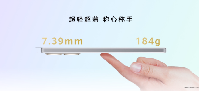 机身采用直边中框设计,遵循极简美学,简约大气的直边造型,重量约184g、薄约7.39mm的轻盈机身,握持非常舒适。