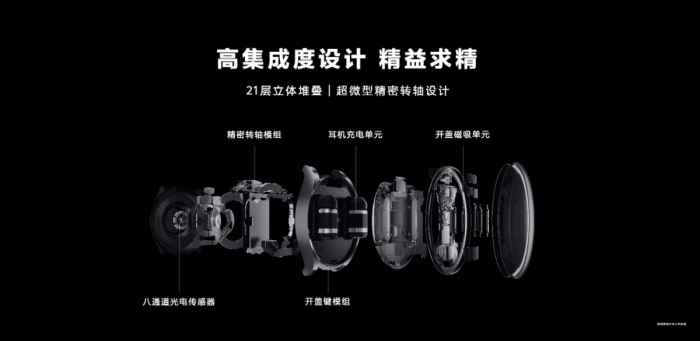 华为WATCH Buds运用高集成度整体架构设计与定制小型化的精密器件,在14.99mm厚度的表体空间中实现了21层结构立体堆叠,同时将一对单只净重4克的TWS耳机巧妙地放入智能手表当中。弹盖处采用的超微型精密转轴,经过10万次开合测试,更加可靠耐用。