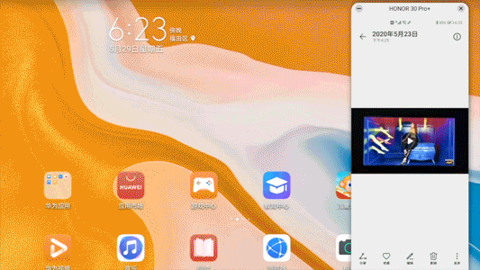 其中,多屏协同可以让手机和平板来一场“系统级融合”,通过蓝牙靠近发现、NFC标签一碰传(需要搭配荣耀平板V6的智能蓝牙键盘)、扫描二维码三种简单方式,即可实现二者在任何地点的快速连接,实现双设备同屏显示。当平板和荣耀手机进行联动后,手机里的照片、视频、文档等可以快速传输到平板上,长按拖拽即可,完全不需要借助第三方应用和数据线便可发送文件,而且还可以直接在平板上控制手机,例如回消息,看视频,刷网页,甚至点外卖,更加方便快捷;尤其是传文档时,打开手机中的“文档管理”进行传输,所有文件均可在这里找到。不过这里需要提醒的是,当平板提示要输入密码时,还是需要在手机中进行操作的,为保证个人数据安全。