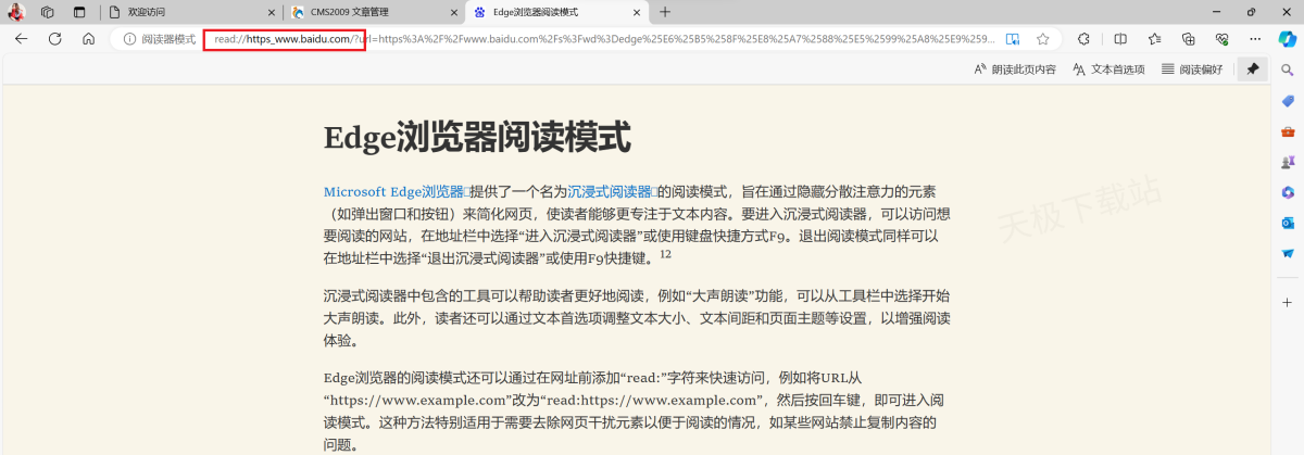 我们打开edge浏览器,进入小说页面,只需在页面上方网址域名前方,加上“read://”即可进入阅读模式,如图。