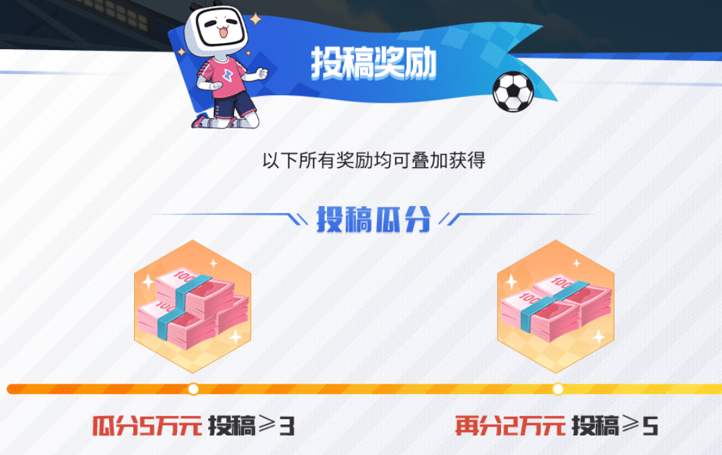 发布相关主题的视频投稿,当数量大于活动要求即可参与现金瓜分活动啦~值得一提的是,参与投稿活动的天数越多,其瓜分的奖金也就越多。比如连续发布5天视频,就要比3天的UP主能拿多一些的奖金。