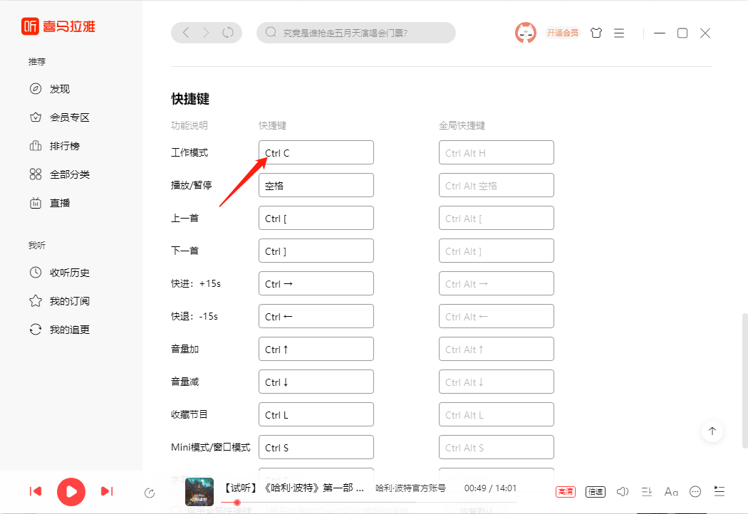 4、同时在【设置】界面下方可以看到【快捷键】,【Ctrl+C】可以帮助我们快速进入工作模式。
