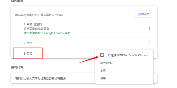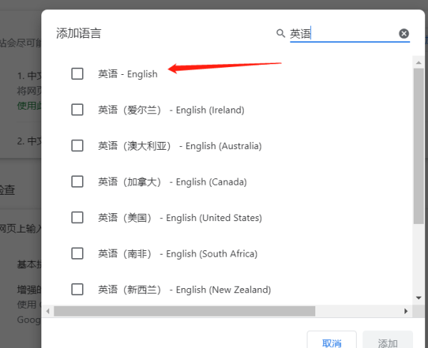 3、在语言设置页面找到“English”,勾选英语,点击右下角的“添加”,如下图所示。