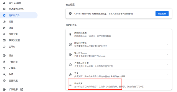4、在隐私设置里面找到“网站设置”选项,如下图所示。