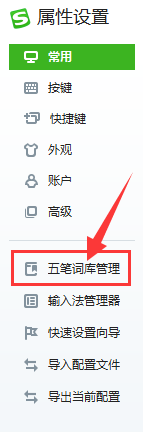 3、第三步,在属性页面中找到“五笔词库管理”这个功能,然后在右侧就会对应的出现很多有关“五笔词库管理”的功能修改选项。