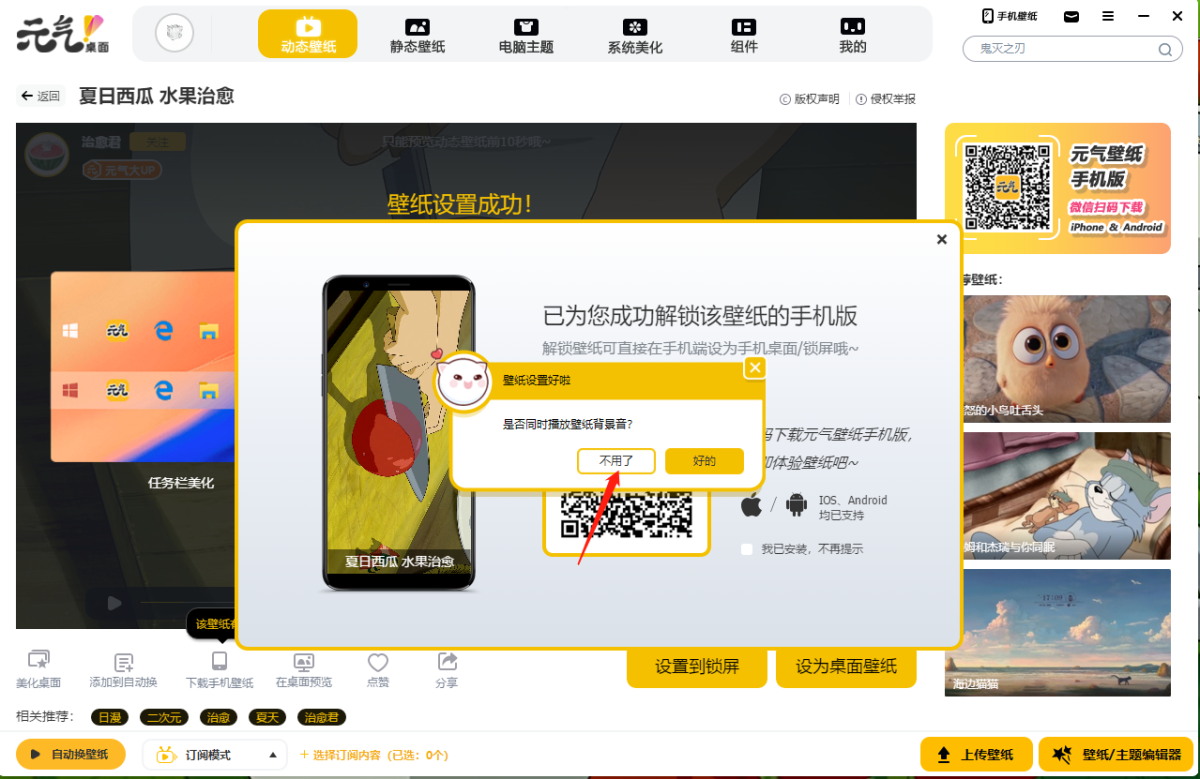 当我们设置一款动态壁纸时,如果制作者为动态壁纸添加了声音,我们设置成功后元气桌面会询问我们是否需要播放背景音乐,如果不想播放背景音乐的话我们点击【不用了】即可。