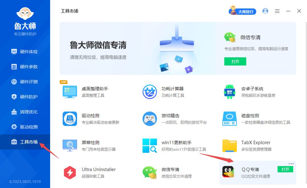 根据小编的亲自使用经验来看,鲁大师这款电脑性能测试工具可以清理QQ垃圾文件,在鲁大师的【工具市场】中,找到【QQ专清】功能,然后打开它。