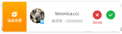 当主播收到其他人的连麦邀请后,在自己的界面上方就会收到提示,可以快速查看对方的昵称,头像以及房间号来决定是否参与连麦、