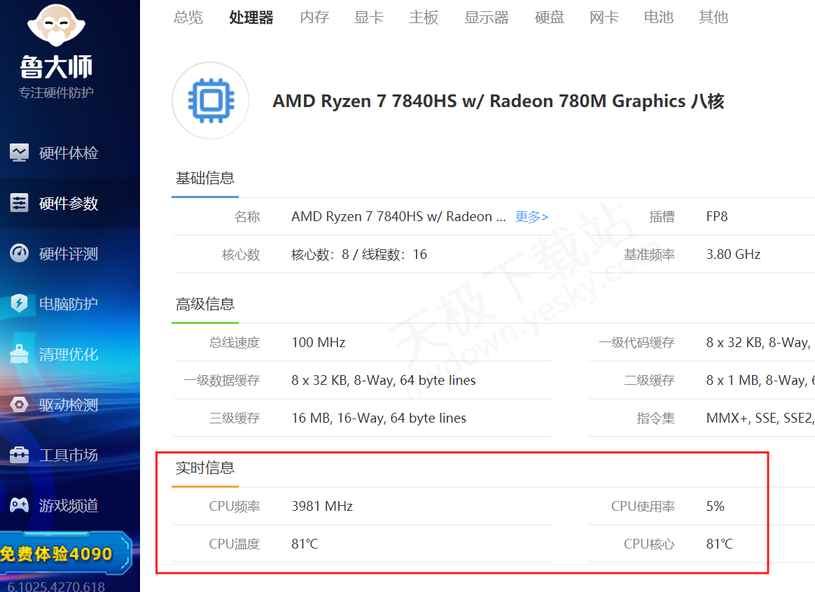据天极软件检测官调查,鲁大师目前支持查询的实时硬件数据包括:CPU的温度、频率及使用率,内存的容量与使用率,显卡温度,硬盘的读取和写入速度,以及电池的电量和电压。