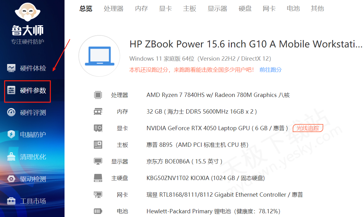 1.下载并打开最新版本的鲁大师,点击左侧【硬件参数】,右侧会显示电脑的各部位硬件。