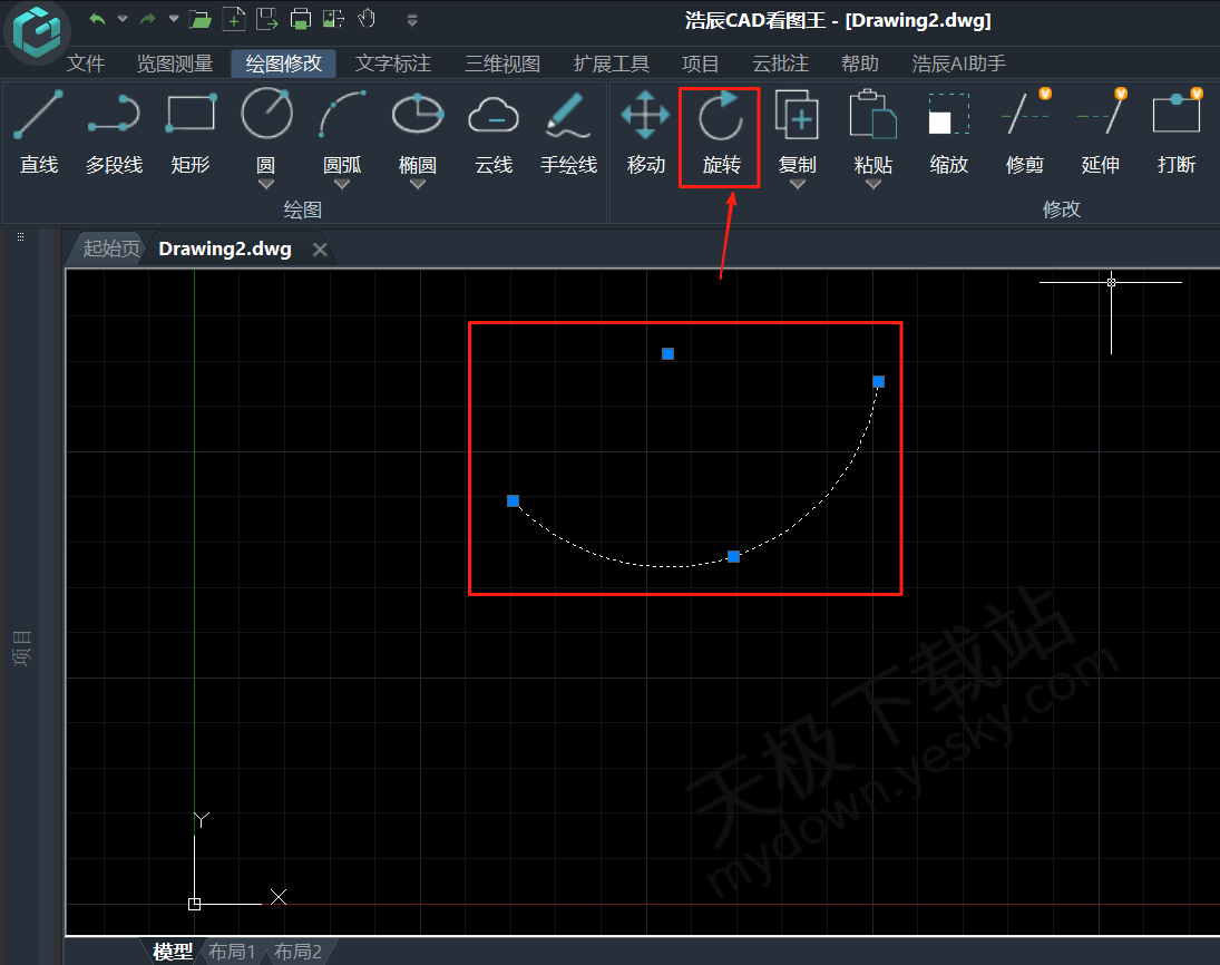1.鼠标选中需要改变方向的圆弧,点击上方【旋转】选项。