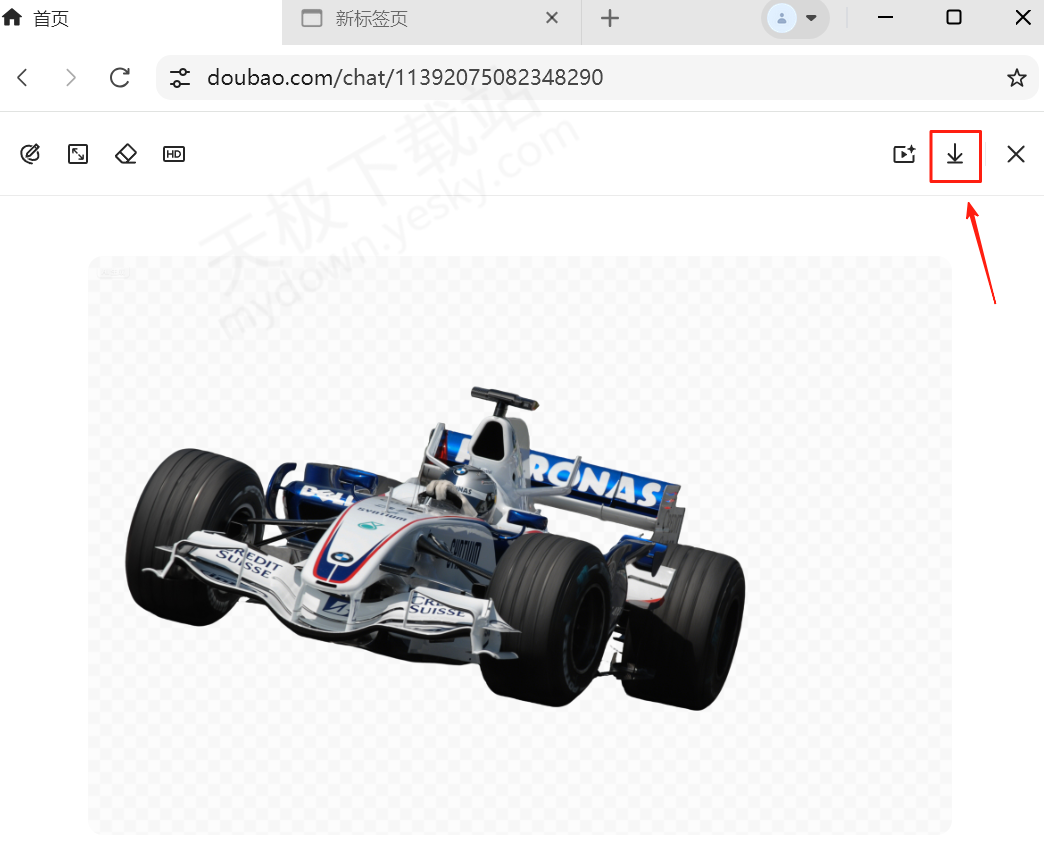3.如图就是豆包AI抠图的最终效果,右上方可对图像进行下载。请注意:豆包客户端生成的图片均自带【AI生成】标识,下载至本地后将显示完整【豆包AI生成】水印,该水印暂无法通过豆包工具去除。