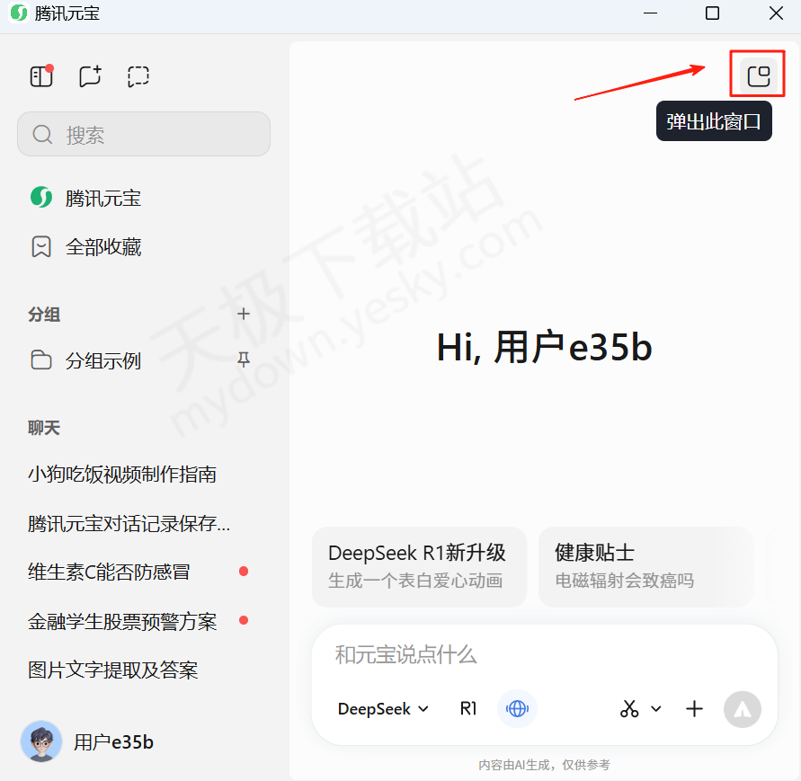 1.下载并打开最新版本的腾讯元宝,在主界面右上角找到【弹出此窗口】按钮并点击。