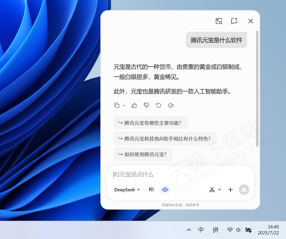 腾讯元宝窗口模式是一种轻量化的交互模式,它能将AI对话界面以独立小窗形式呈现,方便用户在处理其他任务(如文档办公、浏览网页)时,无需频繁切换主界面,随时通过小窗进行AI咨询、内容生成或信息查询,提升多任务处理效率。