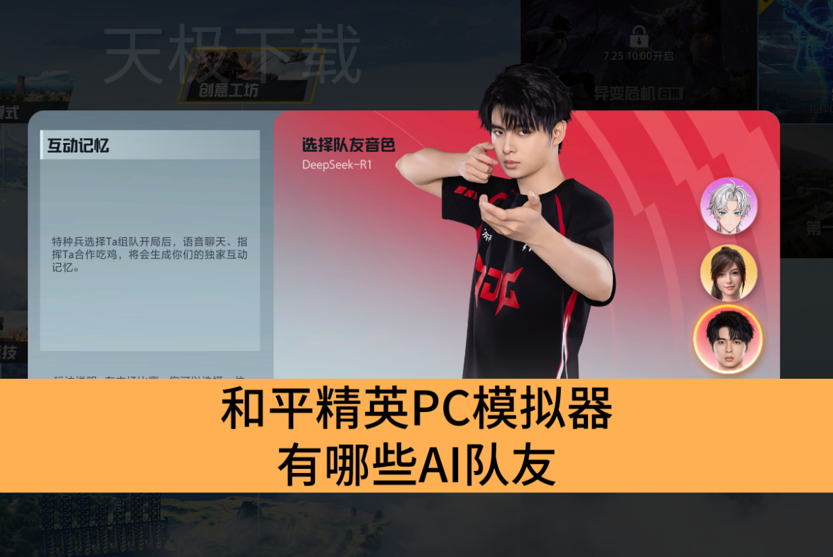 和平精英PC模拟器目前有四位AI队友,分别基于职业选手、数字代言人及赛事解说等真实身份打造,具备不同的战术特性与交互功能: