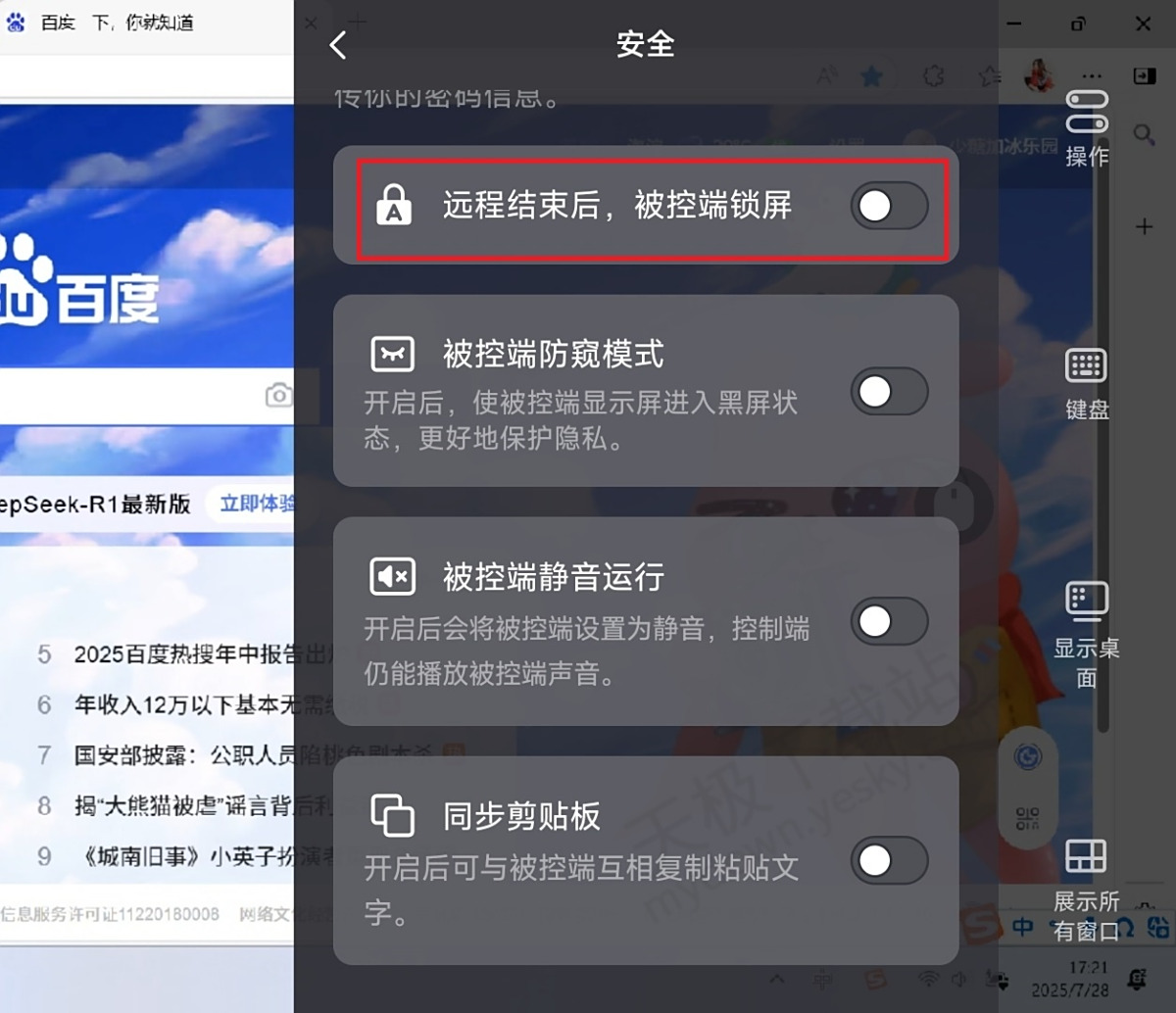 经调查,UU远程电脑版还可以设置“退出远控后自动锁屏”,具体方法为:进入手机控制端,点击【操作】-【安全】,将上方【远控结束后,被控端锁屏】选项打开。