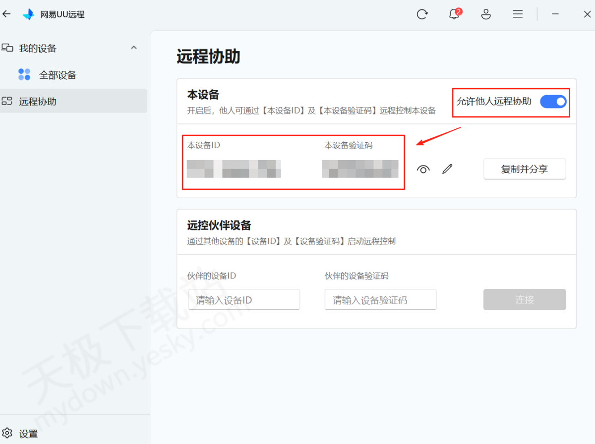 1.下载并打开最新版本的UU远程,点击左侧【远程协助】,勾选右侧【允许他人远程协助】,然后把下方的设备码和验证码发送到手机端。