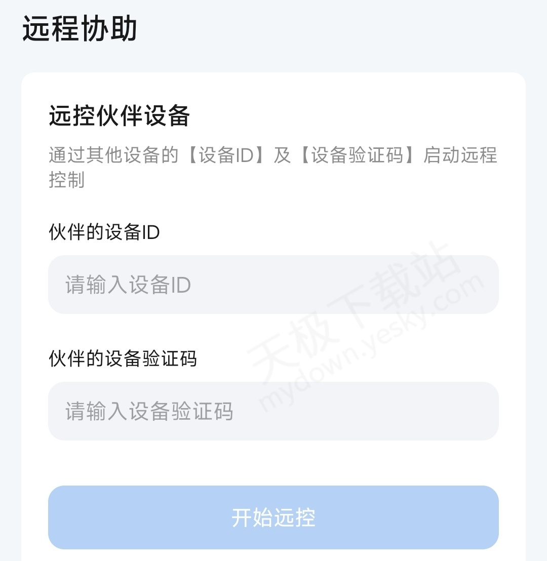 2.在手机端点击【远程协助】,输入设备码和验证码,点击【开始远控】。