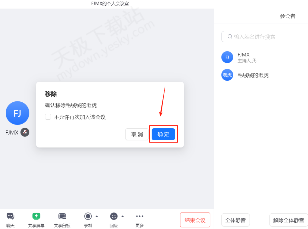 3.此时会弹出一个确认窗口,询问是否不允许该成员再次加入会议,根据实际情况做出选择后,点击【确定】,即可成功移除该参会者。