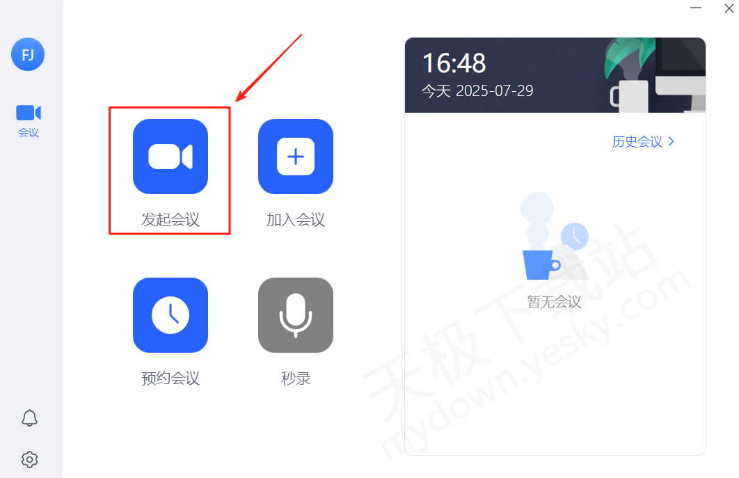 1.先下载并打开最新版本的网易会议客户端,进入界面后点击左侧的【发起会议】选项。