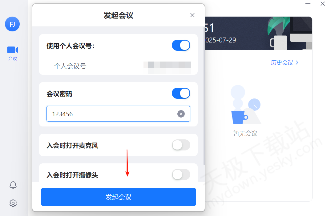 2.之后,根据自身需求选择是否使用个人会议号,并设置会议密码,完成后点击【发起会议】,进入会议页面。
