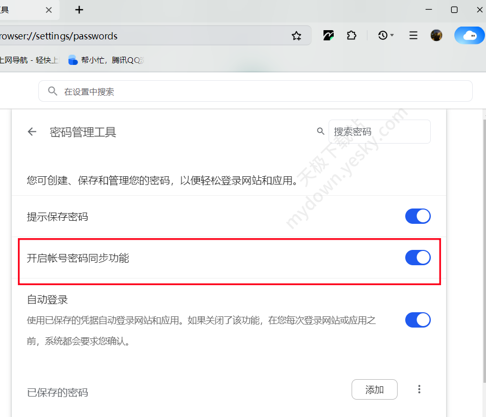 7、开启账号密码同步功能,在其他设备登录账号就能查看所有已保存的网页密码并实现进入网站时快捷登录。