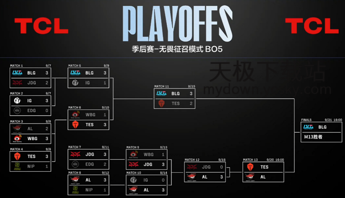 ●季后赛第一轮由登峰组率先晋级的4支队伍(TES、IG、BLG、AL)进行优先选边。