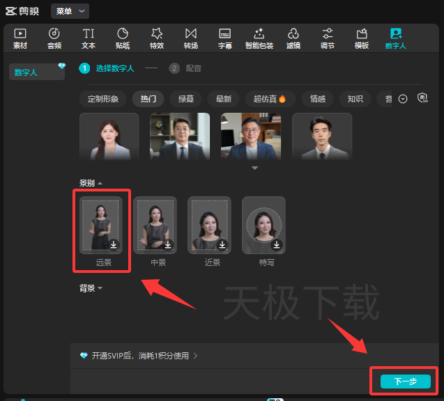 3.下拉,在【景别】一栏选择想要的景别效果,比如【远景】,然后点击【下一步】。
