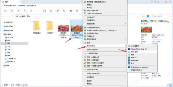 1、找到电脑中想要进行调色的照片,然后按下鼠标右键,在【打开方式】中,选择【WPS图片】选项。