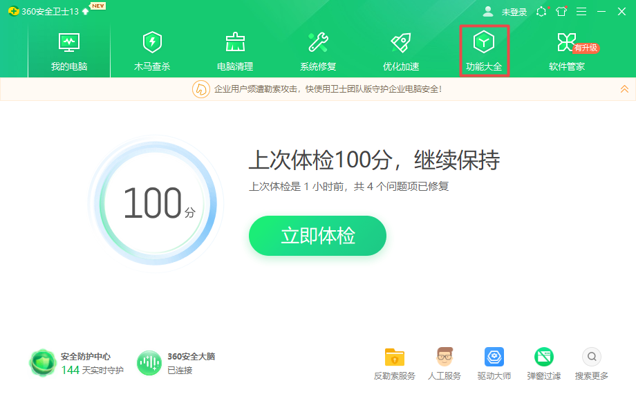 第一步,在电脑的桌面上找到360安全卫士软件,然后点击打开,进入到软件的主界面当中后,在界面的顶部找到【功能大全】功能,并点击进入。