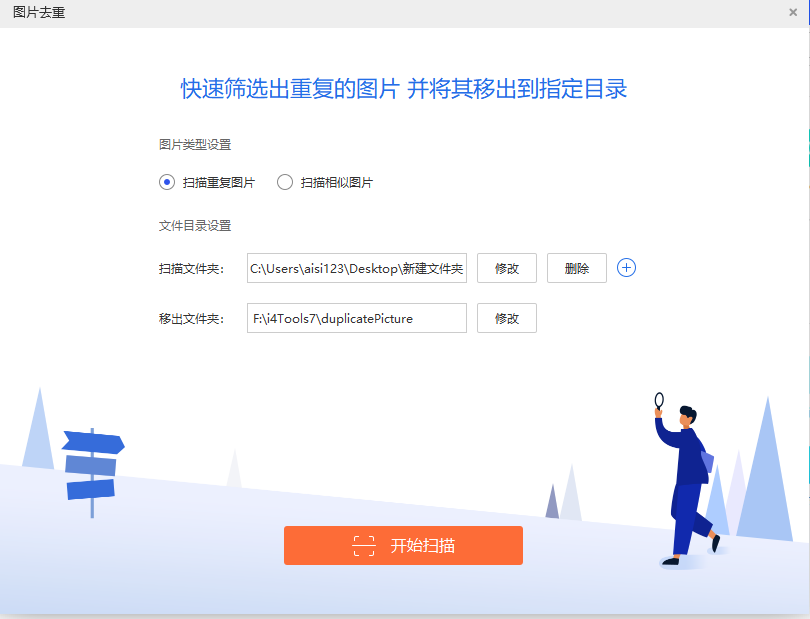 选择需要扫描的图片类型,之后设置扫描文件夹和移出文件夹,点击开始扫描。