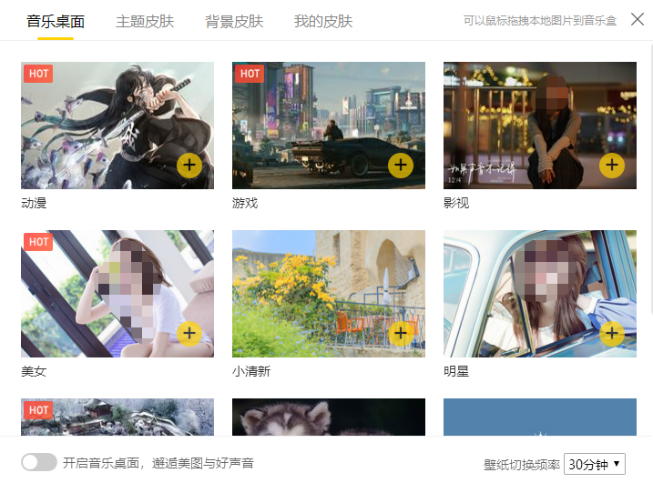 当我们进入皮肤界面时,首先看到的就是音乐桌面,音乐桌面又分为动漫、游戏、影视、明星等种类,我们可以选择自己最喜欢的一类,点击其右下角的加号,即可完成音乐桌面的更换。