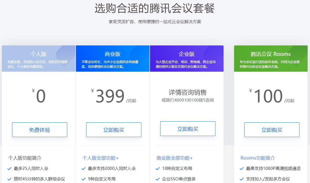 首先我们需要了解一点,腾讯会议电脑版是分为个人版、商业版和企业版的。其中个人版自2020年1月24日起限时免费供大家使用,而且在腾讯会议个人版中就可以体验到软件上几乎所有的功能。但对于腾讯会议的商业版和企业版,就需要付费了,但是也没有花钱的不是,在商业版和企业版中,我们是可以使用到腾讯会议的更多功能以及更强大的配置。