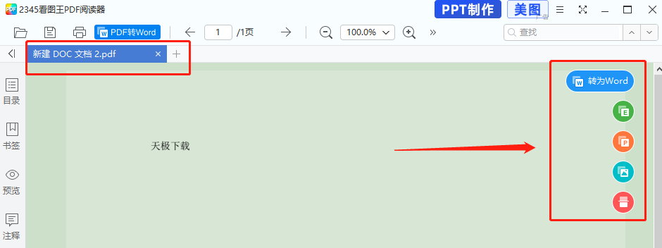 同时,将鼠标移动到右侧的功能选项图标上后,可以选择将PDF文件转为word文件、图片等,还可以进行PDF文件的拆分合并。