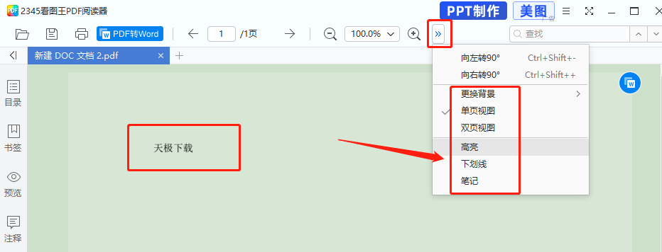 打开2345看图王客户端之后,找到想要打开的PDF文件,双击跳转到PDF文件阅读器窗口后,就能查看编辑PDF文件了。点击页面上方的“显示更多功能”图标,就能对PDF文件进行增加笔记注释,以及高亮和下划线操作。