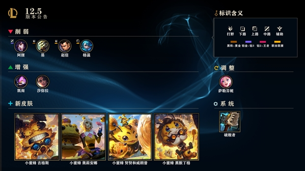 据官网消息,英雄联盟今日凌晨1点开始全区停机维护,发布12.5版本,预计停机时间为1:00-12:00。本次更新将削弱阿狸、格温、剑圣、赵信四个英雄,修复了18项Bug,并带来全新“小蜜蜂”系列皮肤等。阿狸W技能基础伤害降低,法力消耗提升,E技能法力消耗提升,格温的被动技能对野怪伤害降低,E技能额外攻击距离降低;剑圣Q技能伤害和额外暴击伤害降低、E技能和R技能现在会在Q技能期间暂停,并且能在Q技能期间激活E技能后几级基础伤害降低、普攻缩短冷却的效果会随着技能急速的增长而降低;赵信E技能冷却时间提升,R技能的免疫伤害时长降低。据官方介绍,12.5版本将持续近一个月,12.6版本计划将于3月31日发布。