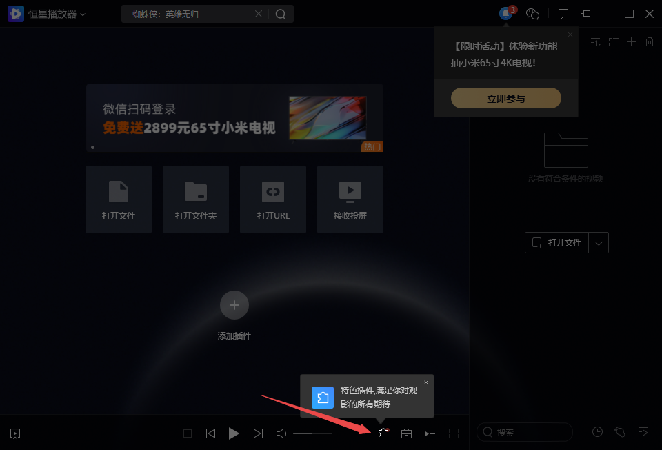 1、打开PC电脑版恒星播放器软件,然后找到界面底部中间位置的【插件】图标,并点击它。