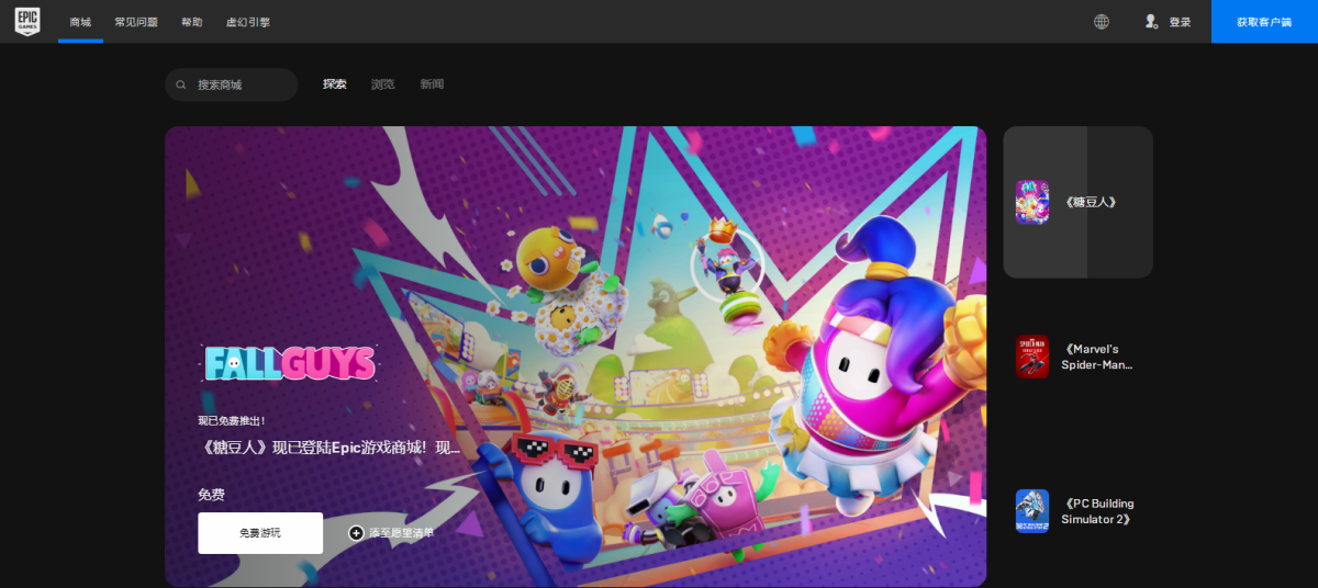然后,要为大家推荐的PC端好用的电脑游戏平台为Epic,它也是一款拥有各类热门游戏产品的游戏平台,该平台拥有很多Steam都没有的众多厂商独占游戏,像是目前非常火爆的、免费的糖豆人游戏,就可以在Epic游戏平台上来玩耍,再像是战神、卡里古拉2、国王之鸟等等游戏也都可以畅快地玩耍。