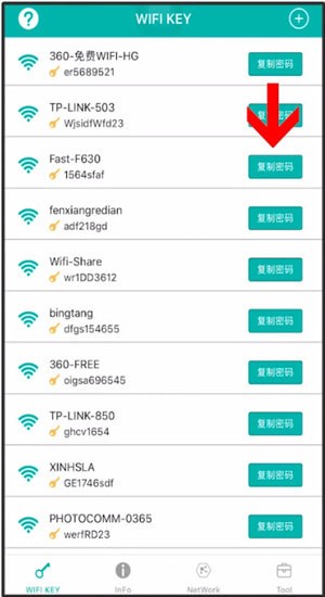 ?2、在手机上下载WiFi密码查看App,进入后点击复制密码,然后打开微信粘贴到对话框即可查看WiFi密码了。?