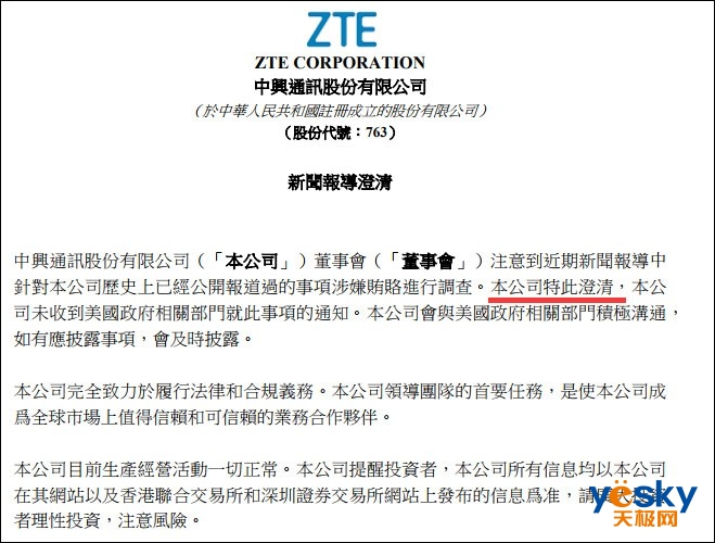 3月16日中午12时54分,中兴通讯在港交所发布澄清公告:其董事会注意到近期新闻报道中针对其历史上已经公开报道过的事项涉嫌贿赂进行调查,该公司未收到美国政府相关部门就其涉嫌贿赂进行调查的通知。