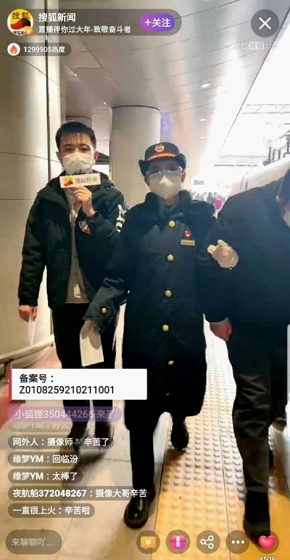 搜狐《致敬奋斗者》用直播方式记录了小于护送刚做完眼部手术的乘客上列车的过程。她搀扶着乘客缓慢地走,还细心地伸出右手,防止行人碰撞。
