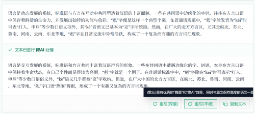 平衡模式:具有优秀的“降重"和”降AI"效果,同时与原文保持高度的语义一致。