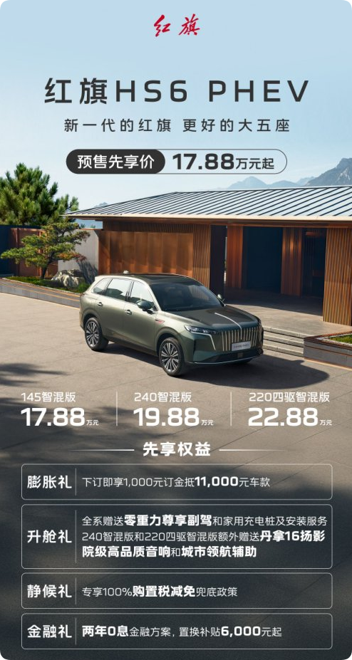 ??此次红旗HS6推出极具竞争力的预售方案,预售先享价17.88万元起,涵盖三大版本:145智混版17.88万元、240智混版19.88万元、220四驱智混版22.88万元。同时叠加多重诚意好礼,进一步降低家庭购车门槛: